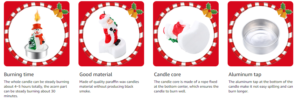 Burning time: the whole candle can be steady burning about 1-2 hours totally, the Christmas tree part can be steady burning about 10 minutes